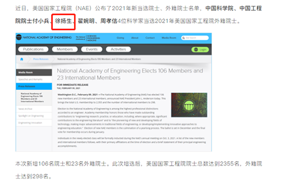 據悉:當地時間2月9日,美國國家工程院發布通知,(NAE)公布2021年新當選院士、外籍院士名單,本次 新增106名院士和 23名外籍院士。此次增選后,美國國家工程院院士總數達到 2355名,外籍院士達到 298名。其中,中國科學院、中國工程院院士徐揚生入選!