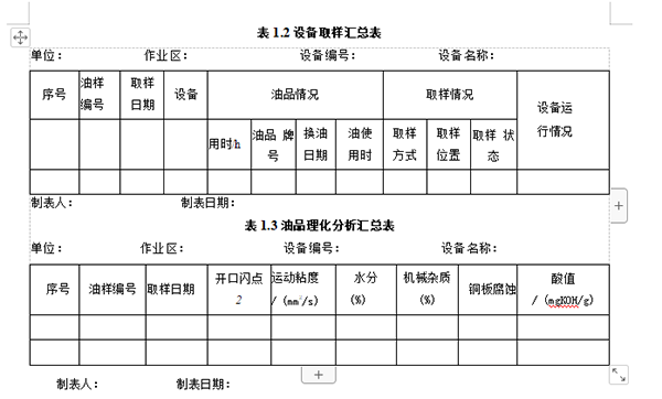 為了便于傳遞信息,對各類數據進行對比和匯總分析,需要生成各類報表, 以備分析需要選擇。生成的報表可包括:①油液報表,包括油樣明細表、單機 取樣記錄匯總表、油樣月度匯總表等;②油品理化分析報表,包括油樣分析結 果表、單機潤滑理化分析匯總表、單臺設備潤滑記錄表等;③鐵譜分析結果表, 包括磨粒成分匯總表、磨粒濃度數據匯總表、鐵譜分析記錄表等;④油液監測 結論表等。下面給出了 “設備取樣匯總表”和“油品理化分析匯總表”的樣表, 見表1.1和表1.3。